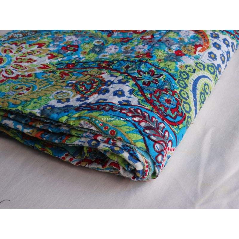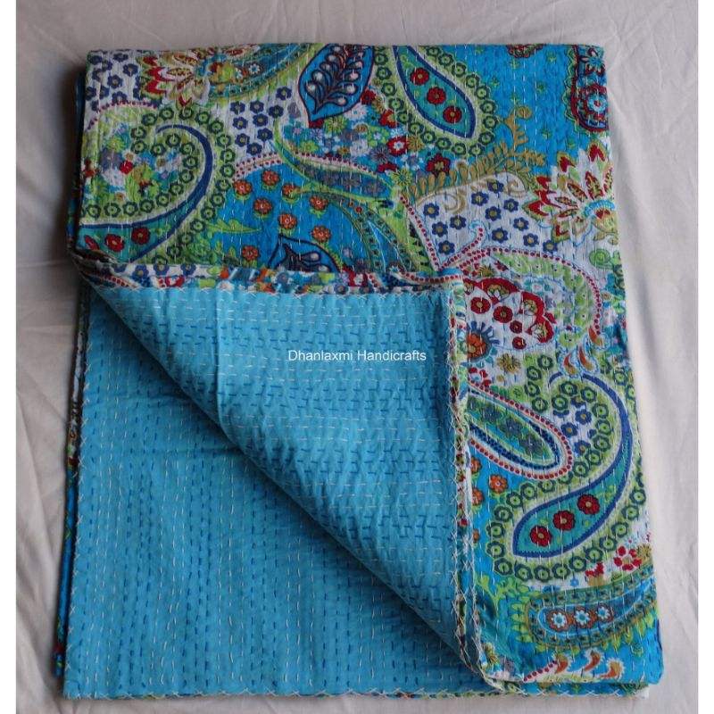 Indian Paisley Sky Blue Beautiful Home Decor Wholesale Kantha Bedspread Handmade Printed Cotton Kantha Quilt