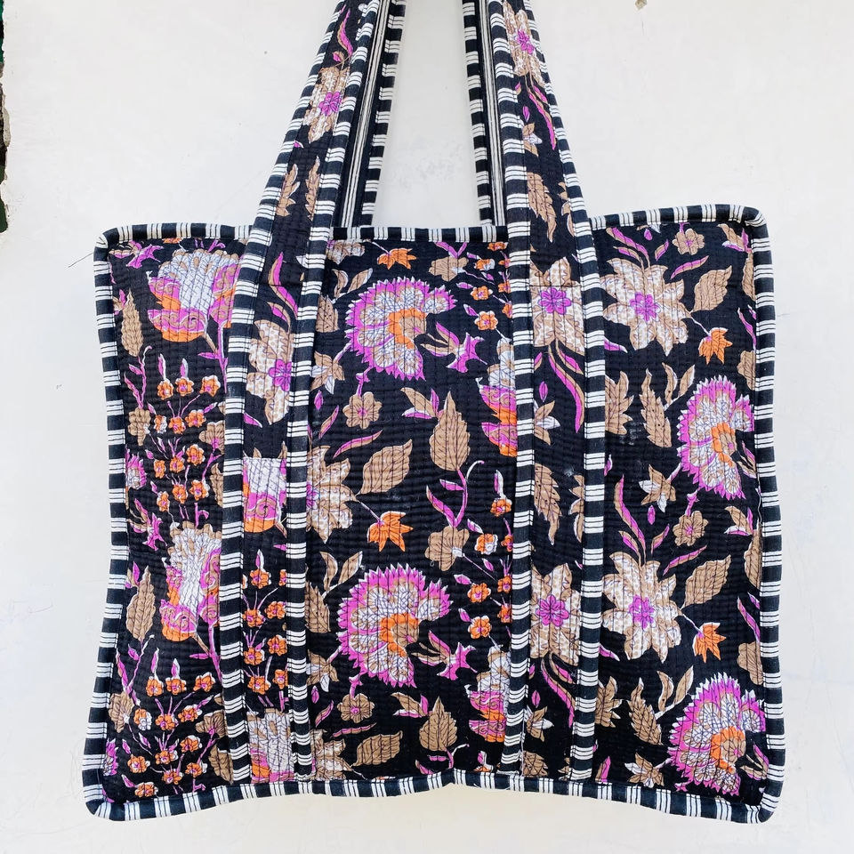 Indian Printed Cotton Quilted Tote Bag for Women Unique Printed Zipper Shopping Bag with Top Handle Recyclable for Summer Use