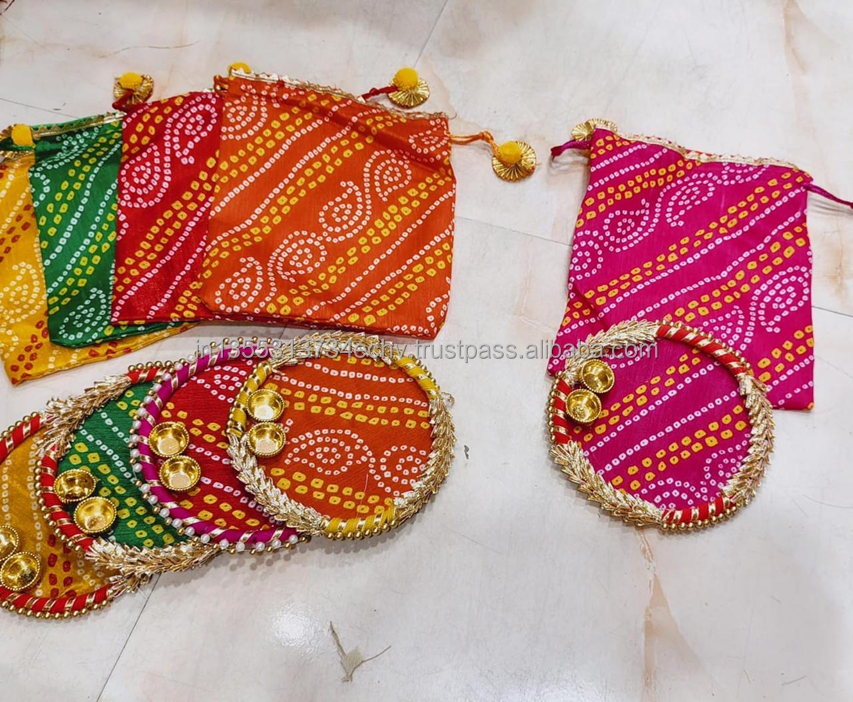 Indian Silk Potli with Kumkum Pooja Thali Shagun Return Gift For Guest Wedding Favor Drawstring Potli Bag Kumkum Holder Platter