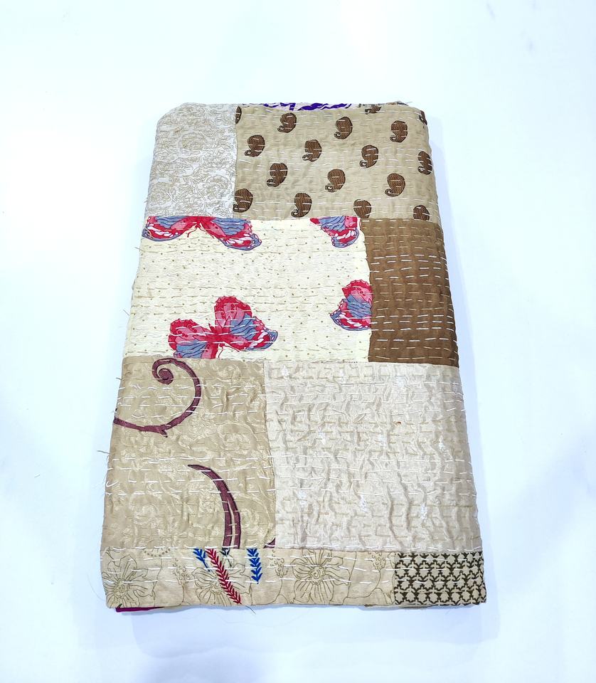 Indian Silk Reversible Kantha Quilt Hand Quilted Floral Pattern Bedspread Throw Floral Embroidery Technique for Home Bedding