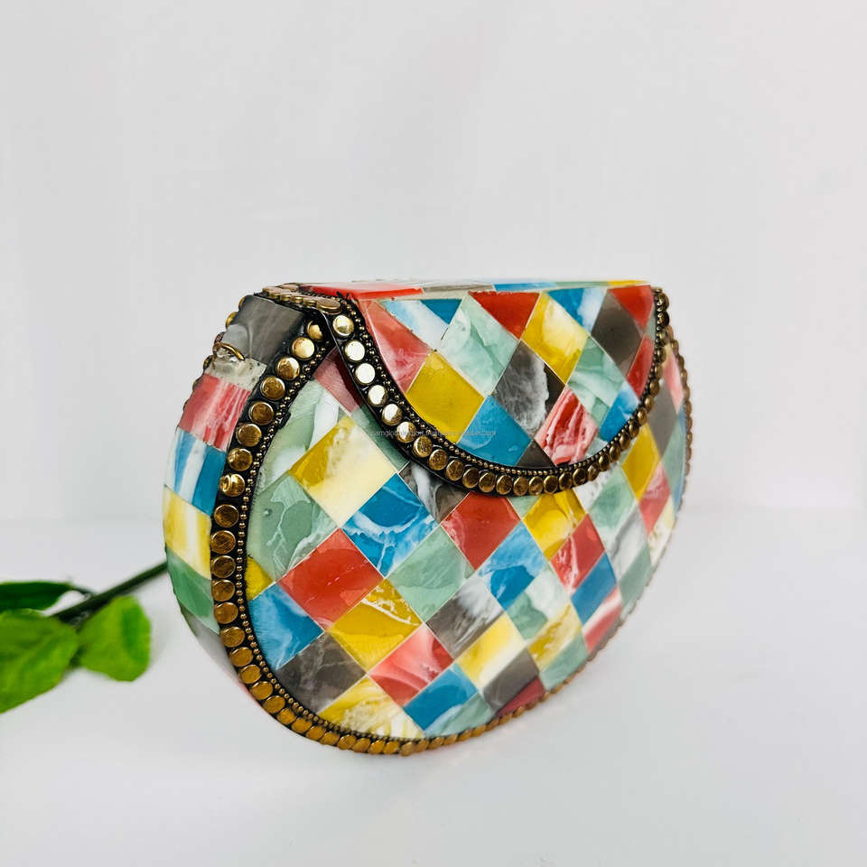 Indian Modern Gold-Plated Polished Sculpture Aluminium Bag Multi-Marble Color Evening Purse Antique Style Sling Shoulder Party