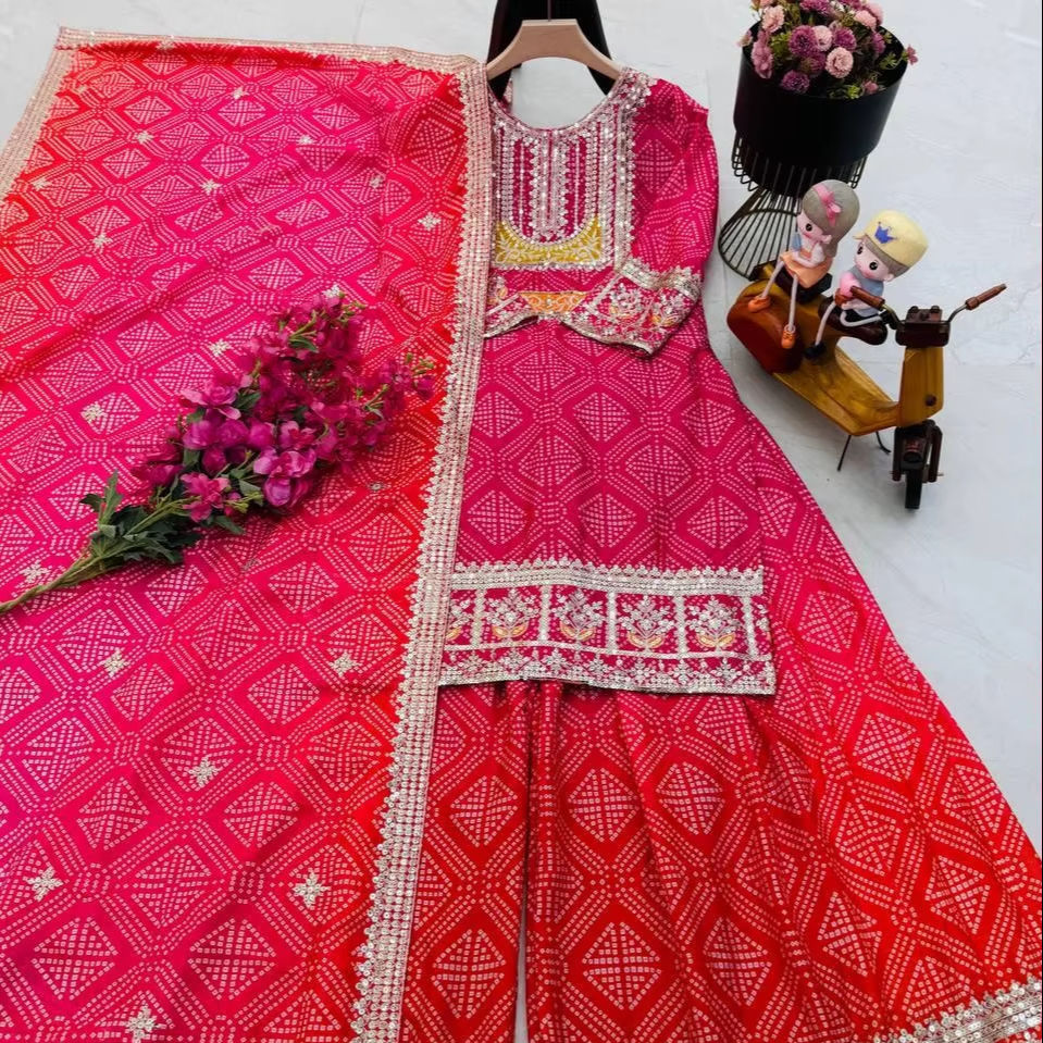 Indian Stylish Wear Chinon Silk Print & Embroidery Sequence Top With Sharara With Printed & Embroidery Sequence Work Dupatta