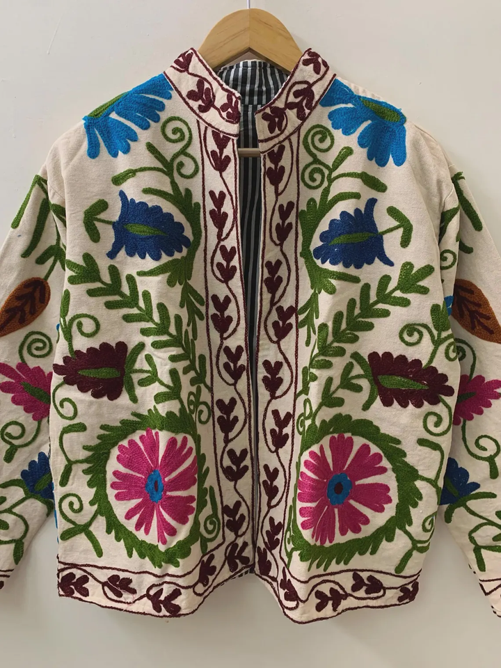 Indian Summer Jacket with Floral Suzani Embroidery Printed Cotton Coat with Button Printed Knitted Short Jacket
