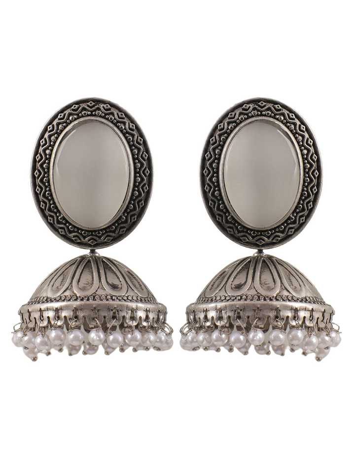 Product Name:Chic Oxidised Silver Jhumkas with White Crystal Beads for Fashionistas