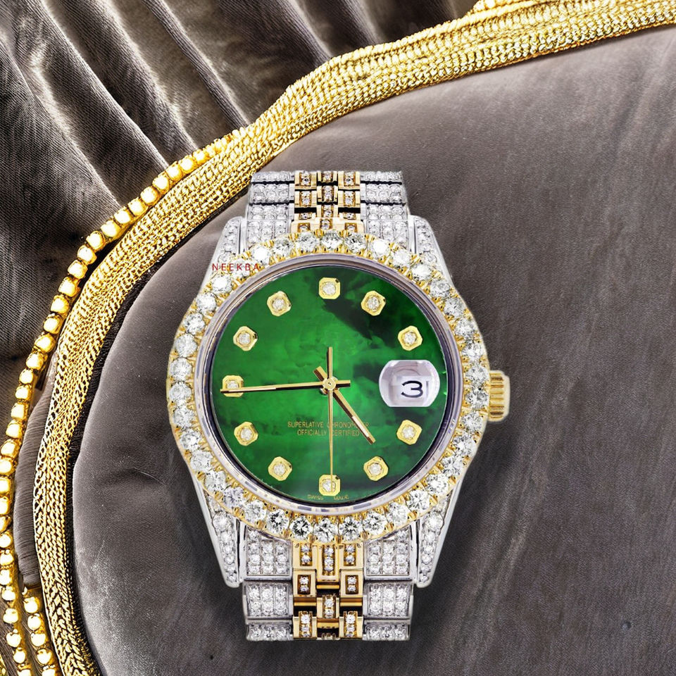Indian Supplier's Mother of Pearl Dial Moissanite Watch-Green Color Edition Hand-Set Moissanite Watch with Two-Toned Steel Strap