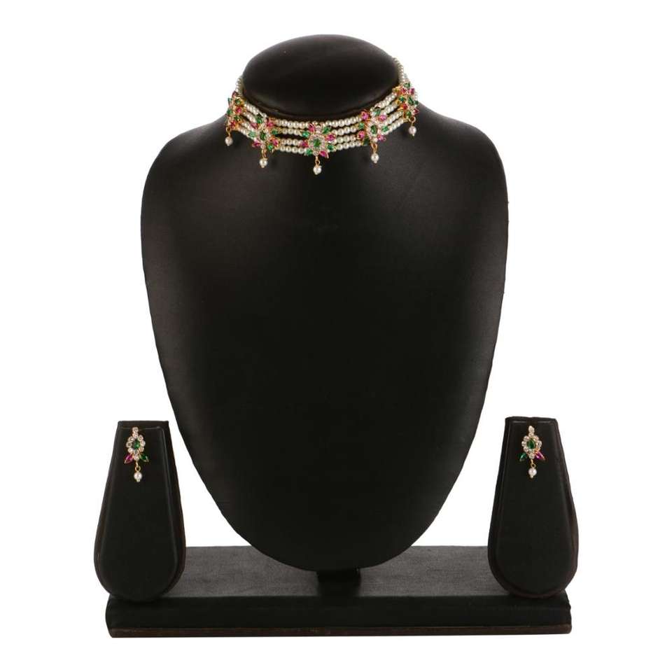 Indian Traditional Bridal Necklace Set Multicolor Floral Shape Stone With Pearl Gold-Plated Crystal Jewelry for Weddings