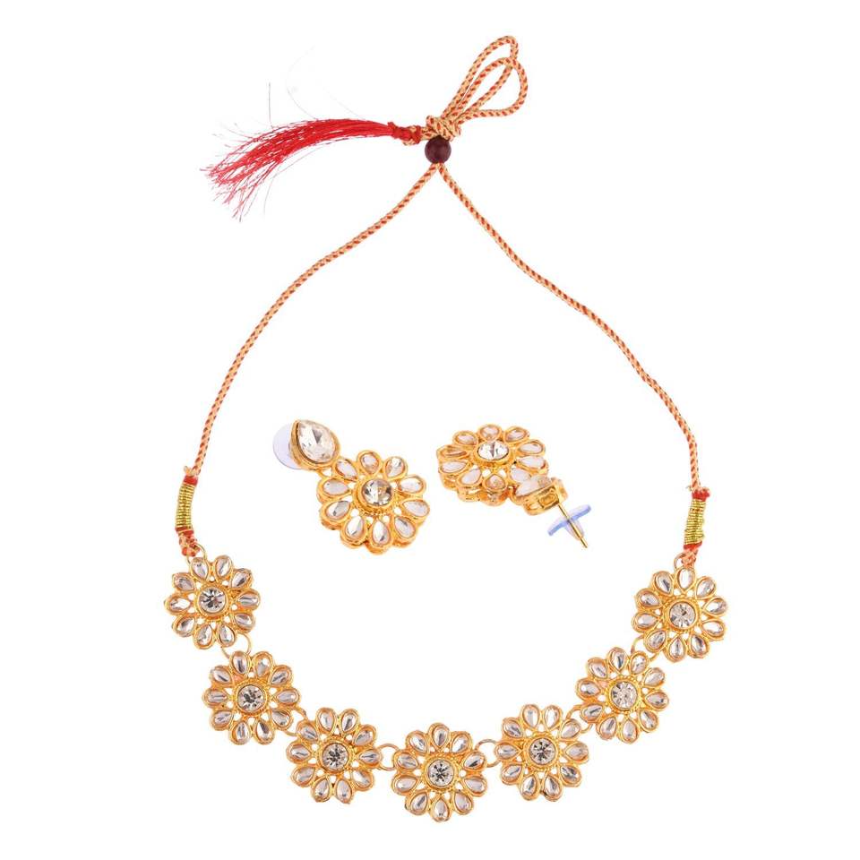 Indian Traditional Designer Flower Ethnic Tear Drop Earring Crystal Choker Bridal Necklace Wedding Indian Jewellery Set, White