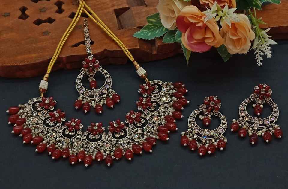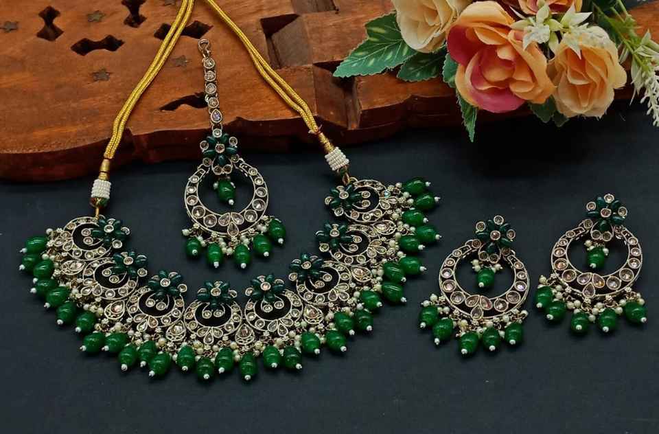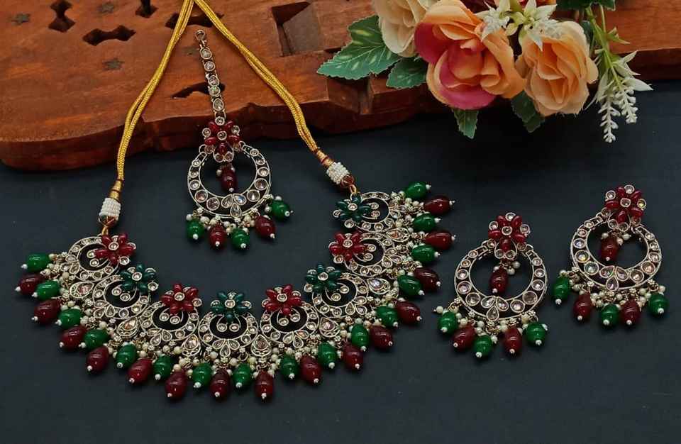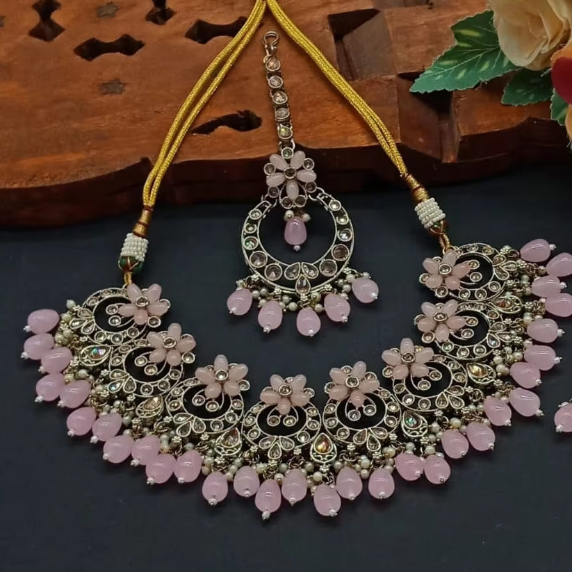 New Design Gold Plated Traditional Drop Pearl & Stone Studded Earring Mangtika Choker Necklace Set & Jewellery Set for Women