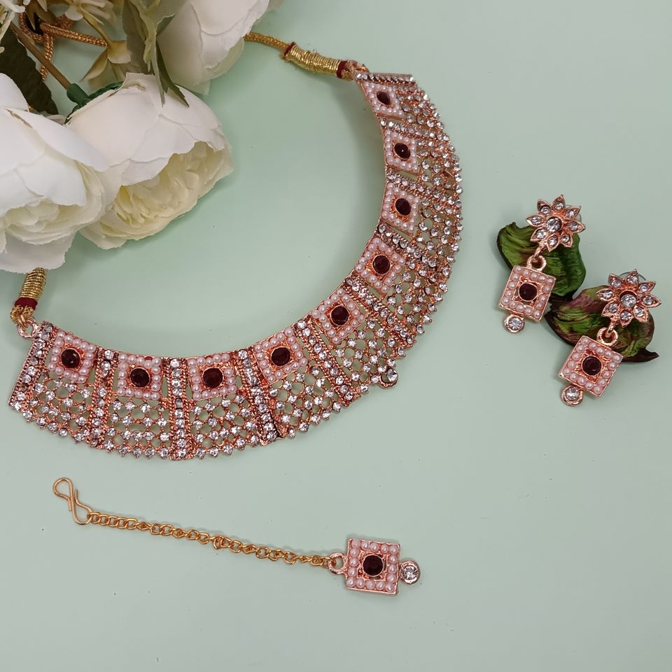 Indian Traditional Jewellery Antique Floral Faux Pearl Crystal Choker Necklace Earrings Maang Tikka Jewellery Set For Women, Red