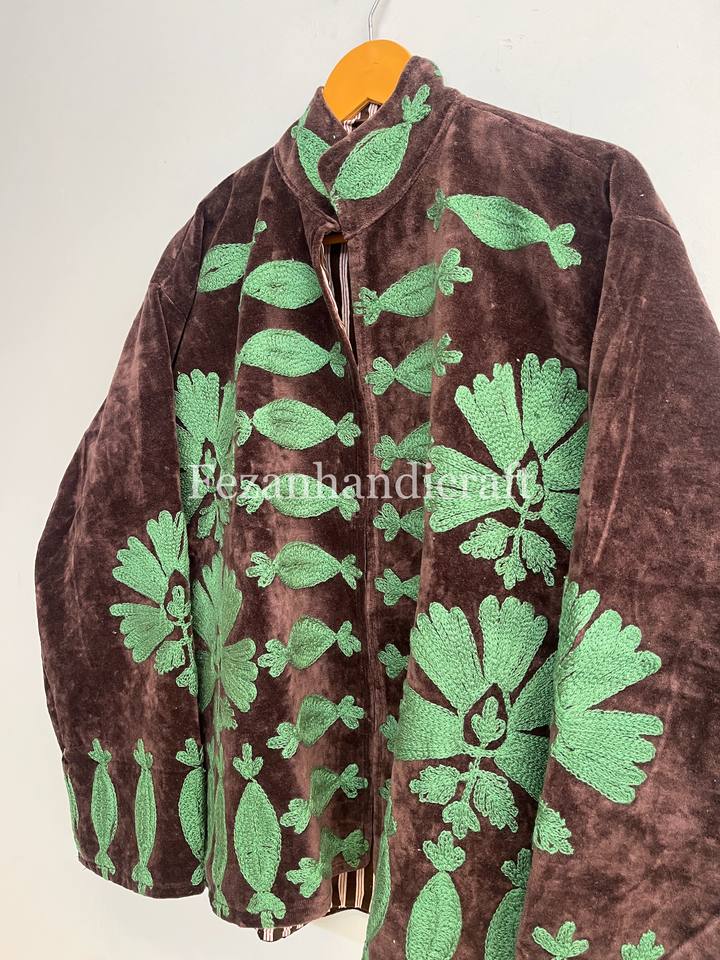 Indian Velvet Suzani Jacket Uzbek Embroidery Coat Handmade Short Unisex Jacket Boho Hippie Jacket Two Side Pocket