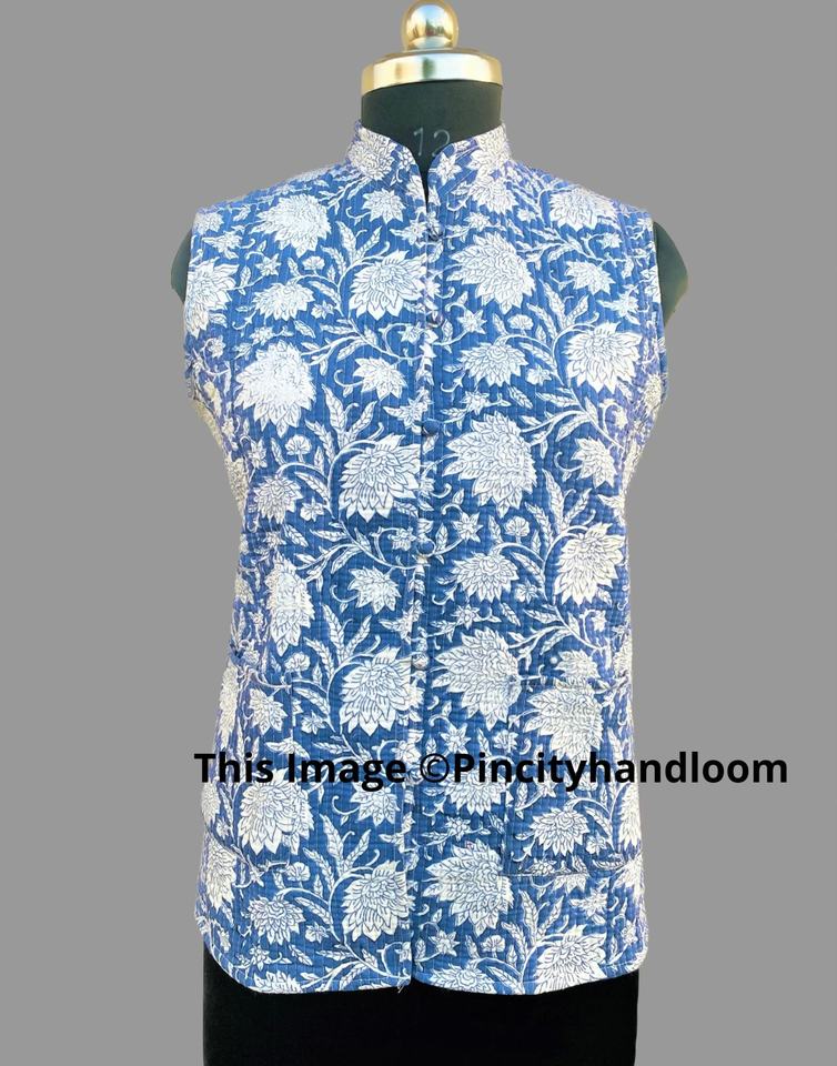 Indian Vintage Floral Hand Block Print Quilted Sleeveless Jacket Unisex Cotton Filled Button Reversible New Style Coat Outer