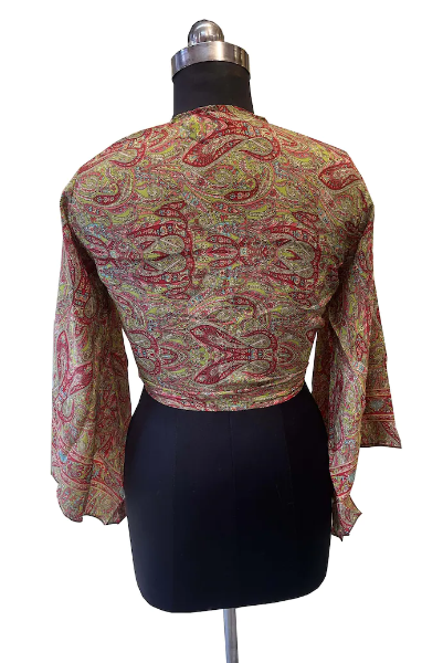 Indian Vintage Silk Modest Blouse Handmade Boho Hippie Style Summer Top with Bell Sleeves and Short Wrap Front Beige