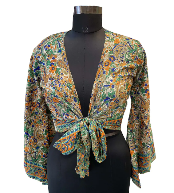 Indian Vintage Silk Pajama Set Recycled Silk Crop Top Wrap Top Palazzo Women Short Length Summer Floral Print Breathable Gifts