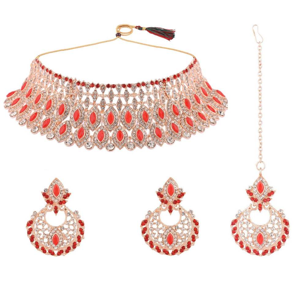 Indian Wedding Jewellery Ethnic Floral Crystal Choker Bridal Traditional Necklace Indian Earrings Mangtikka Jewellery Set, Red