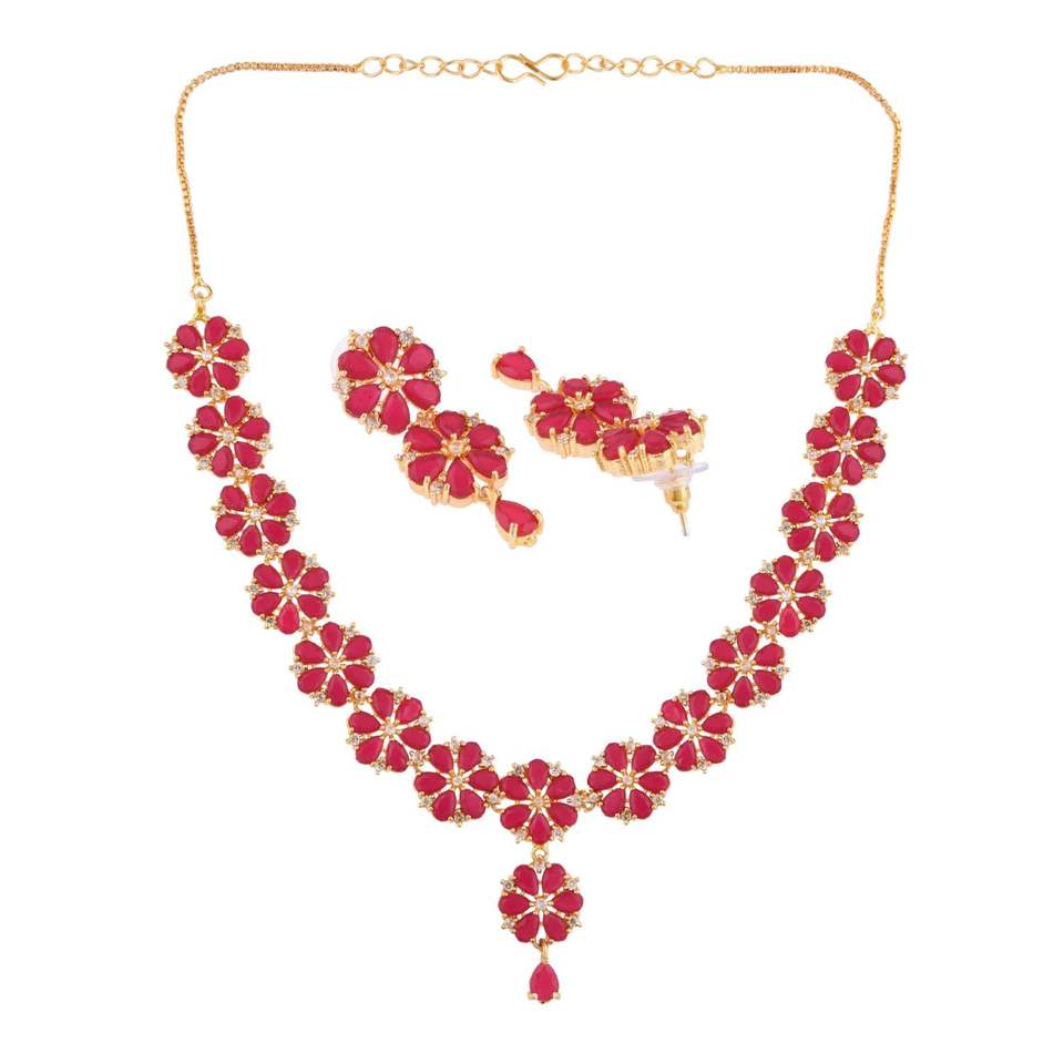 Indian Wedding Jewellery Ethnic Floral Gold Plated CZ Crystal Collar Necklace Bridal Jewellery Indian Dangle Earring Set, Pink