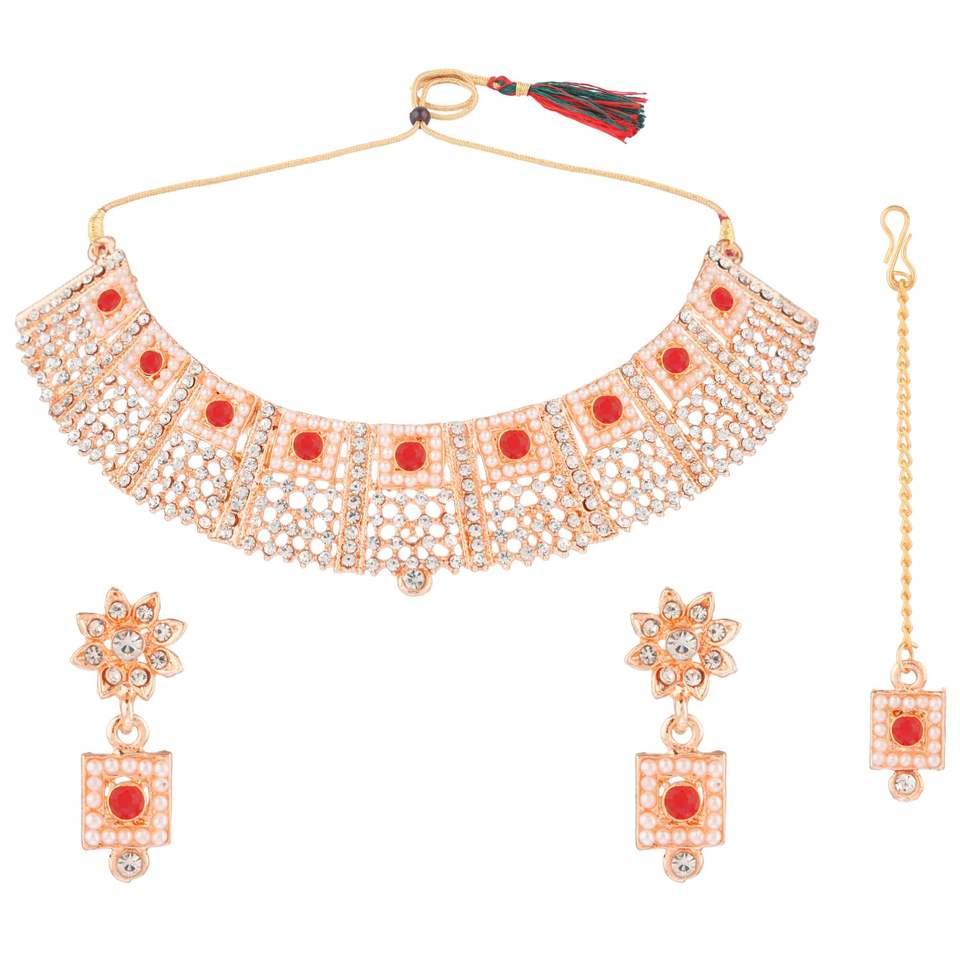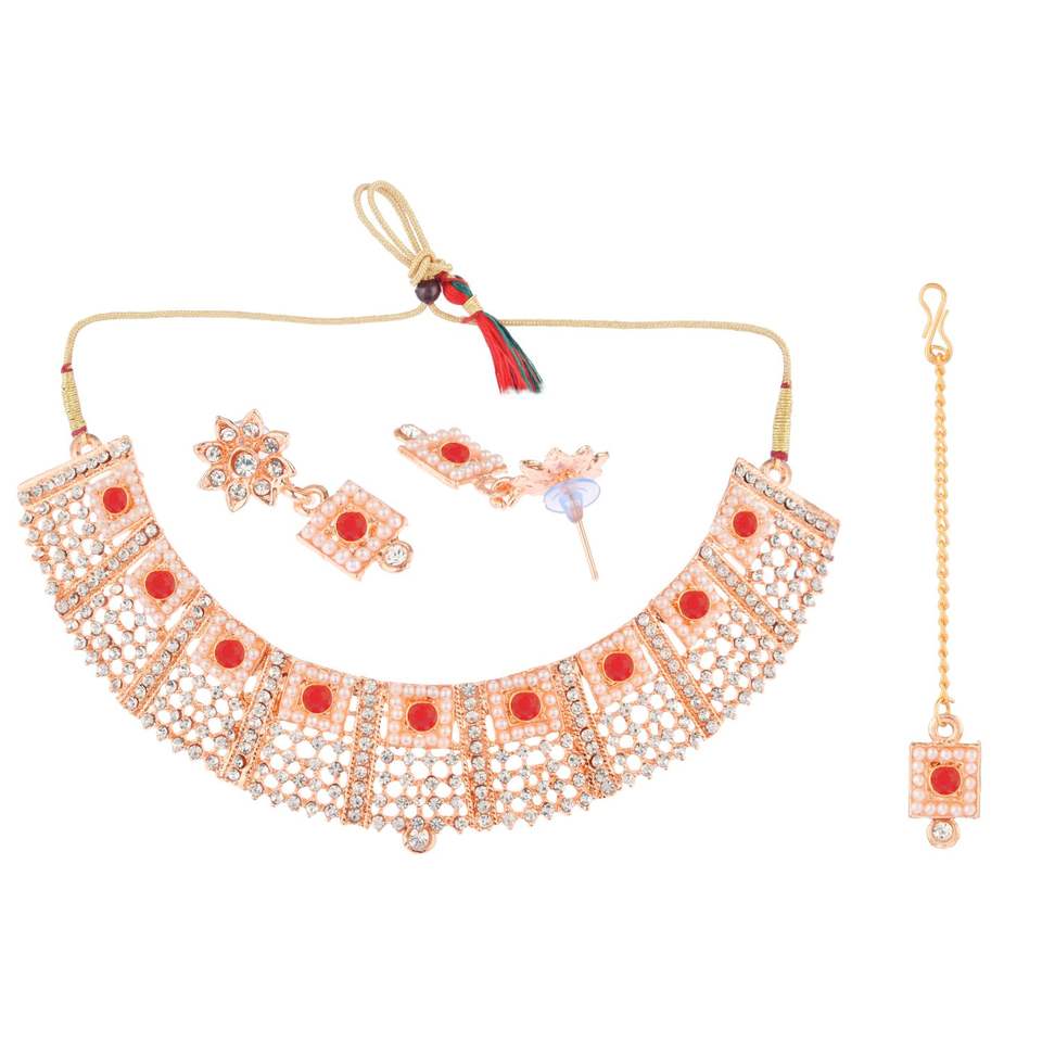 Indian Weddings Jewellery Faux Pearl Bridal Crystal Choker Necklace Dangle Earrings With Maang Tikka Jewellery Set, Red