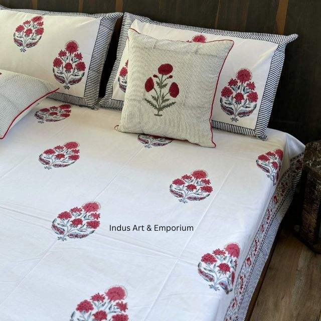Indian Handcrafted Sanganeri Hand Block Printed Bedsheets Bedding Sets Bedsheet with Pillow Cover