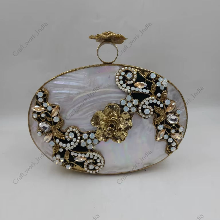 Indian handrafted Mother Of Pearl Oval Clutch With Brass Frame Floral Crystal Work Luxury Handmade Evening clutch bag for women
