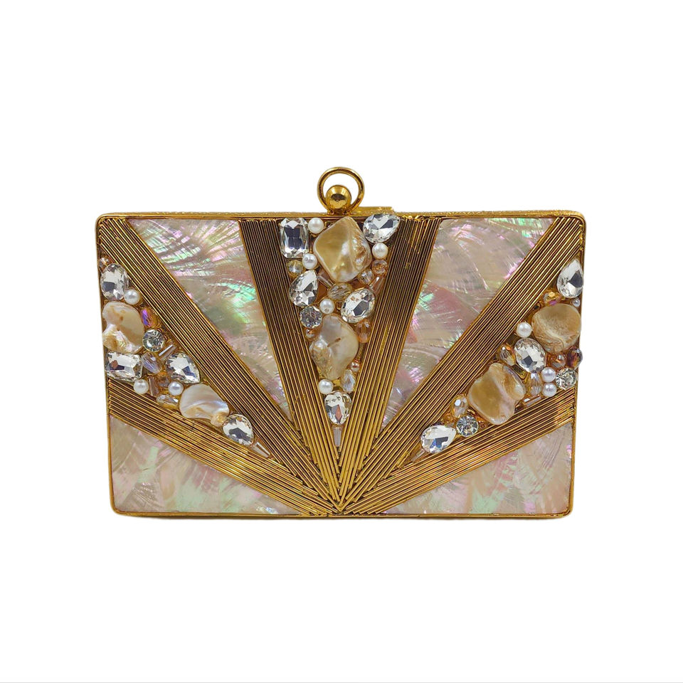 Indian mother of pearl clutch with brass agate crystal detailing luxury handmade evening party statement bag style design