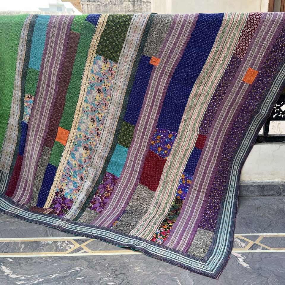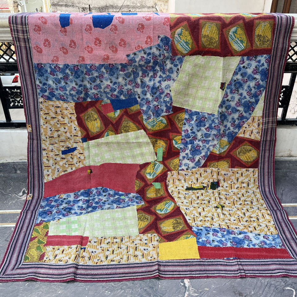 Indian Tradition Hand Embroidery Patchwork and Other Hand Block Printing Design Vintage Sari Kantha Quilt