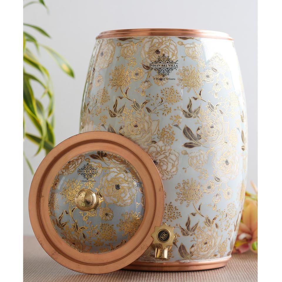 IndianArtVilla Handcrafted Pure Copper Water Pot Dispenser with Dual Gold Print Design, Ayurveda Water Vessel- 10 L
