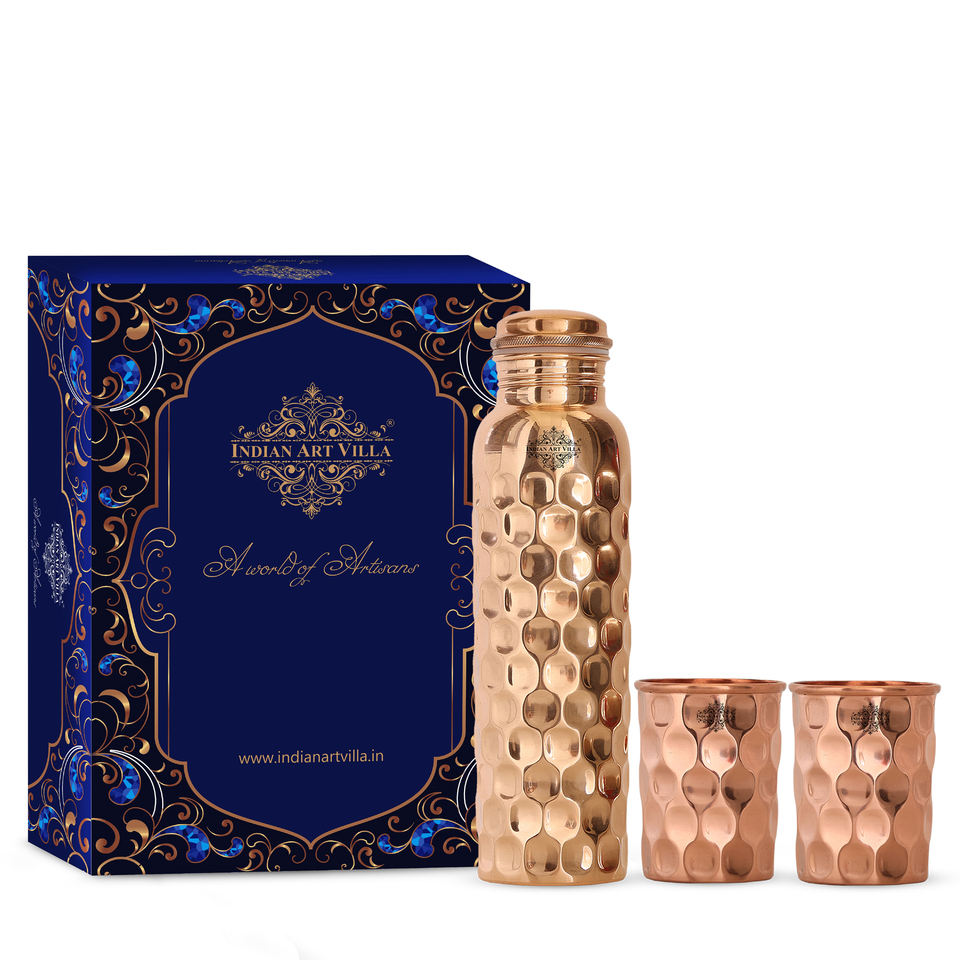 IndianArtVilla Pure Copper Diamond Hammered Design Drinkware Gift Set of 1 Bottle & 2 Glass With Royal Blue Gift Box