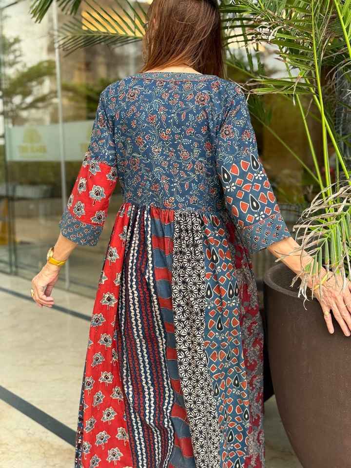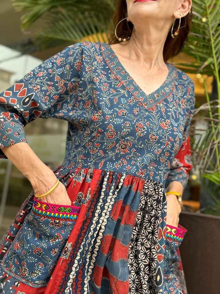 Indigo Blue Ajrakh Cotton Dress Exquisite Block Printed Fabric Colorful Kutch Hand Embroidered Pockets Handmade Vintage Natural