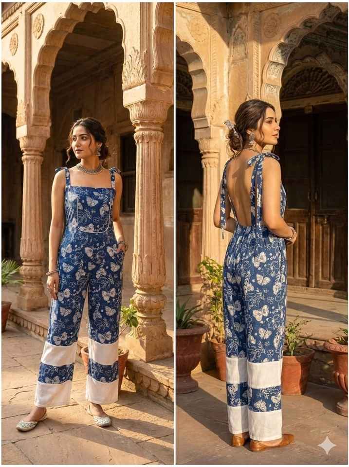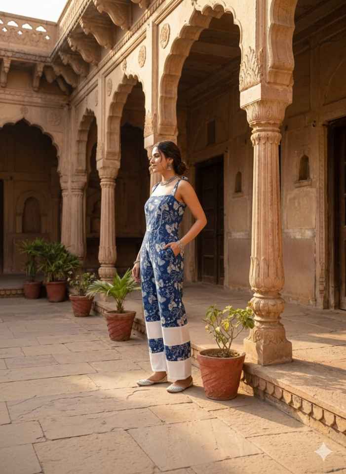 Indigo Blue Digital Printed Midi Jumpsuit Wide Leg Cotton Overalls Women Summer Boho Romper Indian Ethnic 3/4 Sleeve Natural