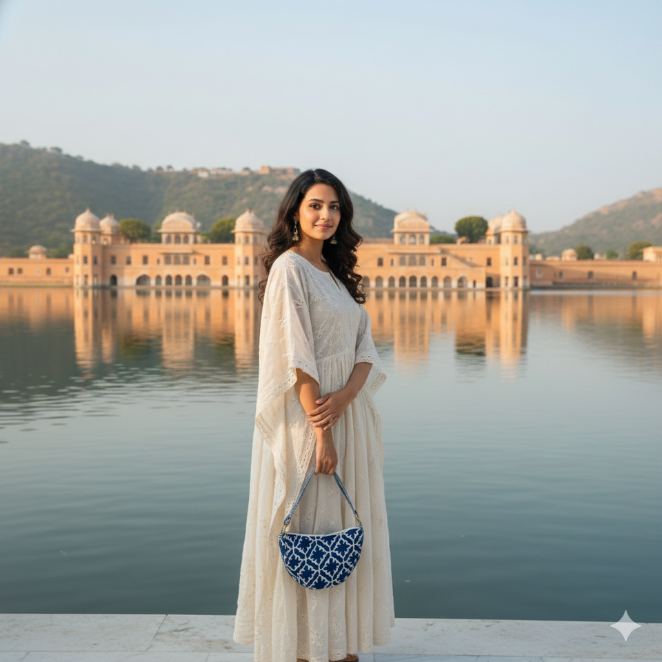 Indigo Geometric Print Cotton Soft Durable Handbag Adjustable Shoulder Strap Zipper Closure Handmade Casual Crossbody Half Moon