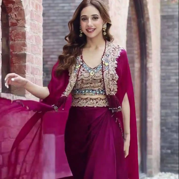 Indo Western Draped Dhoti Style Saree Dress for Women in Mono Banglory Silk with Embroidery Work Shrug Suit