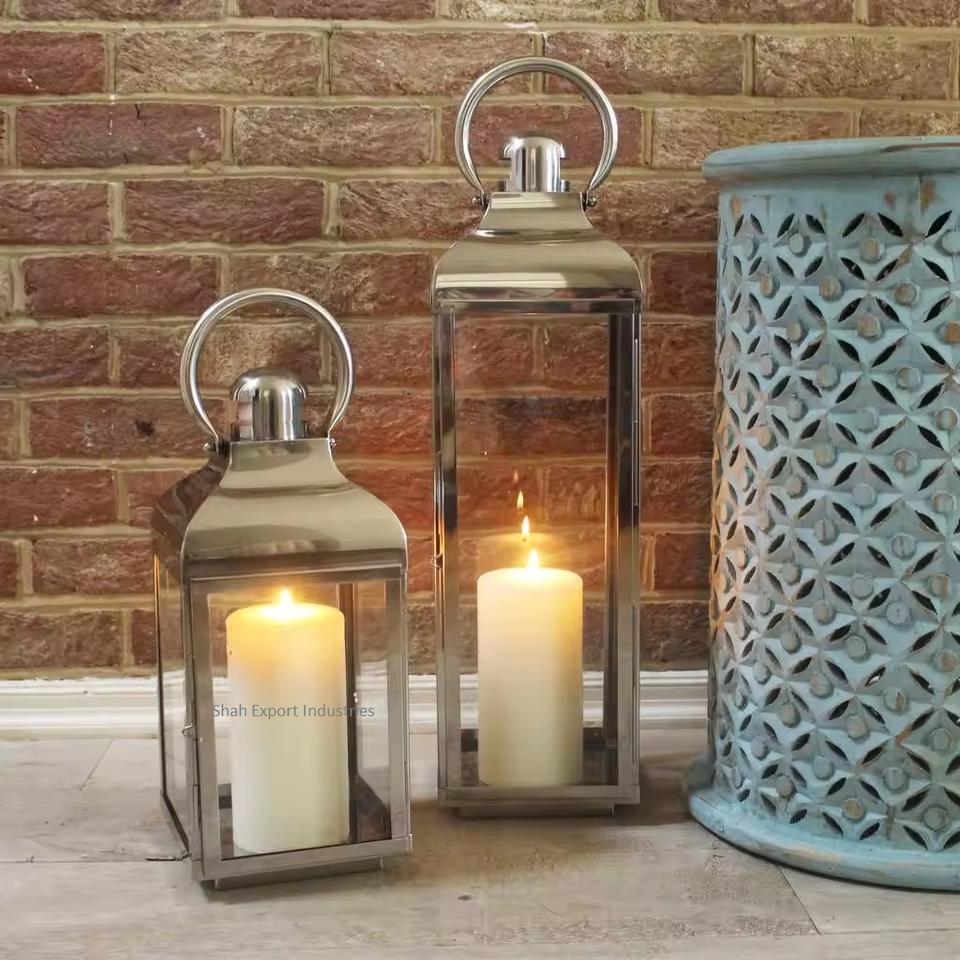 Indoor & Outdoor Decorative Stainless Steel and Glass Candle Lanterns Shiny Silver Tall Lanterns for Garden Decor