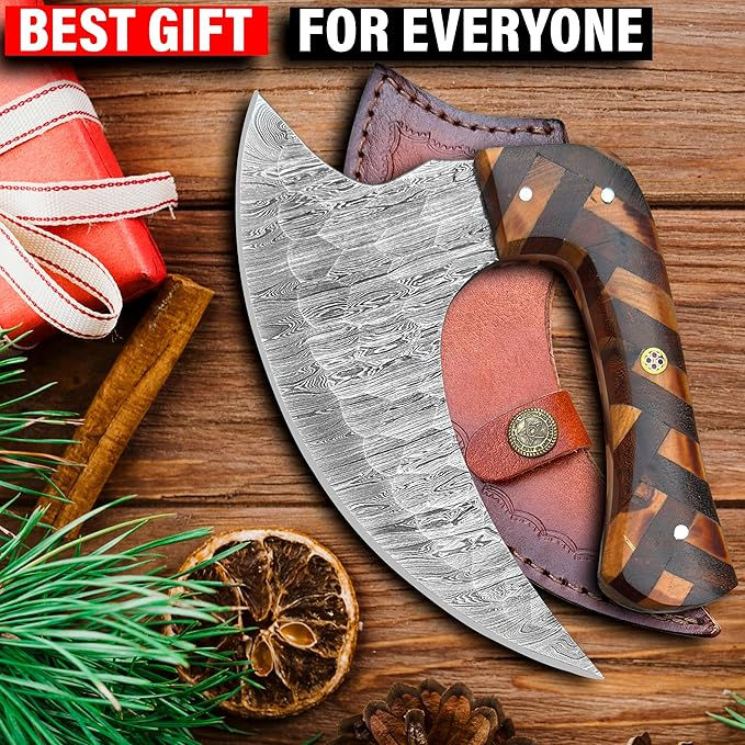 Industrial Damascus Traditional Full Tang Multi-Purpose Custom Steel Axe Pizza Cutter Meat Chopping Utility Knife Leather Sheath