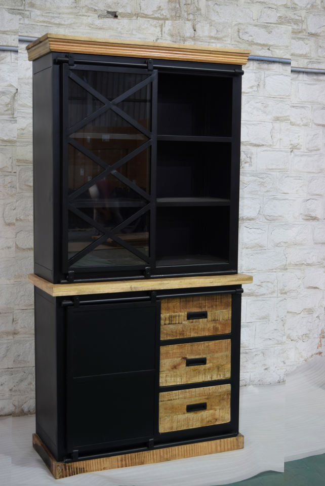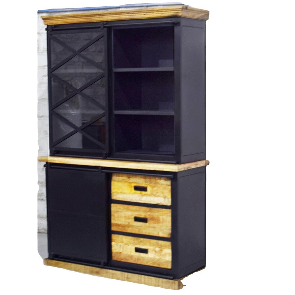 Industrial Design Double Part Glass Door Cabinet Iron and Wood for Living Room Home Furniture-Sale for Farmhouse Use