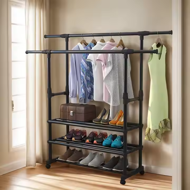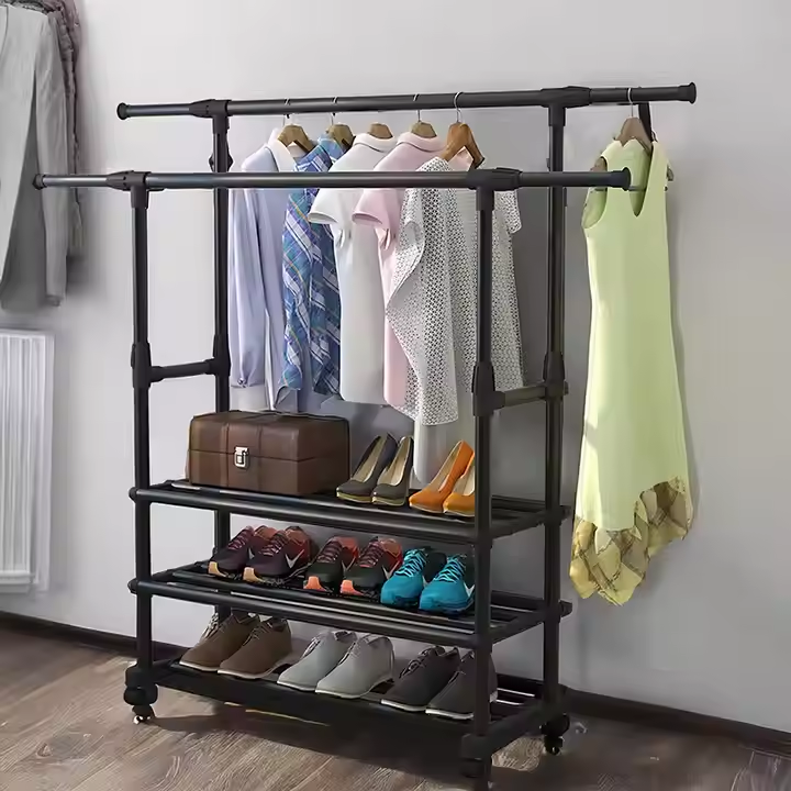 Industrial Dual Rail Mobile Wardrobe Cart Hotel/Boutique Garment Rack for Bulk Clothing Storage for Balcony Bathroom Living Room