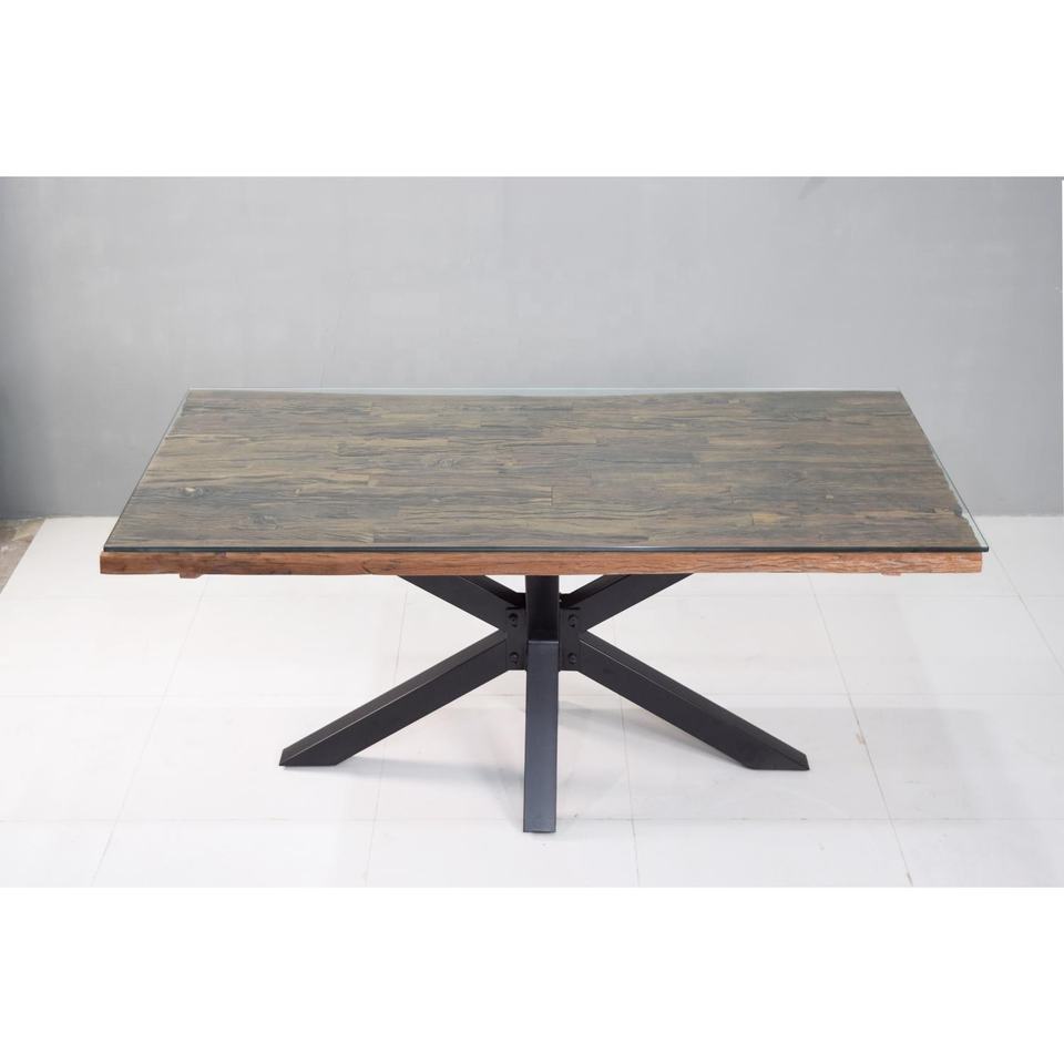 Industrial Iron Folding Leg for Outdoor Use Reclaimed Railway Sleeper Wood Top with Thick Glass for Home Dining Restaurant Table