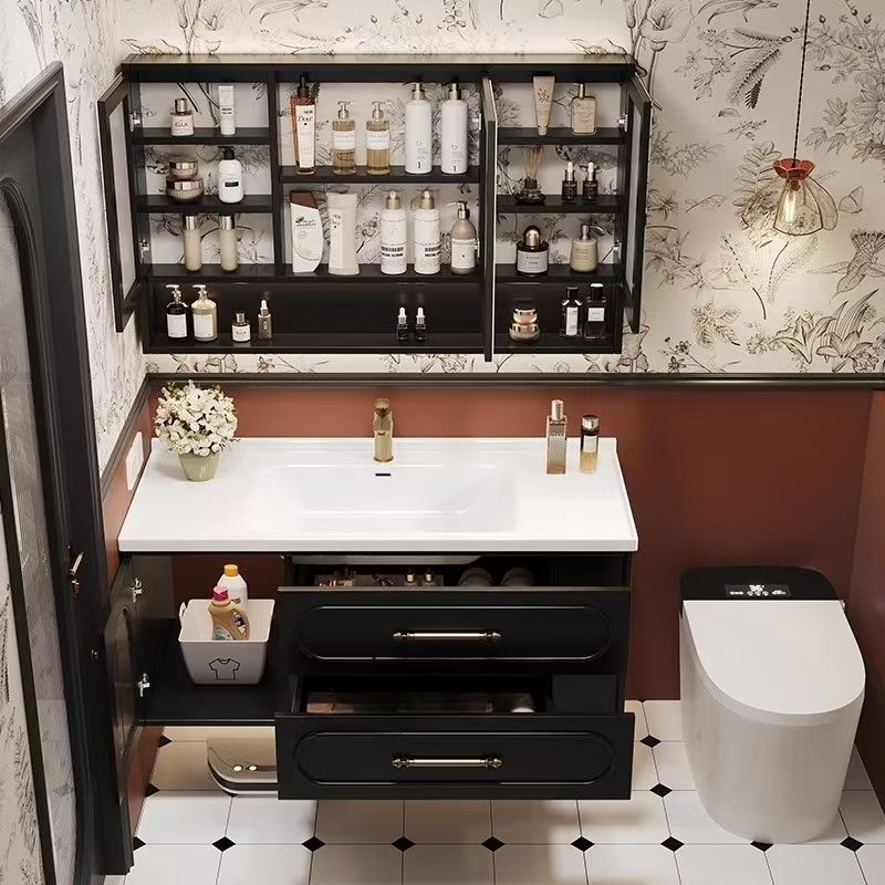 Industrial Style Bath Vanity Set with Black Metal Frame, Concrete Countertop & Vessel Sink, Water-Resistant Storage Unit