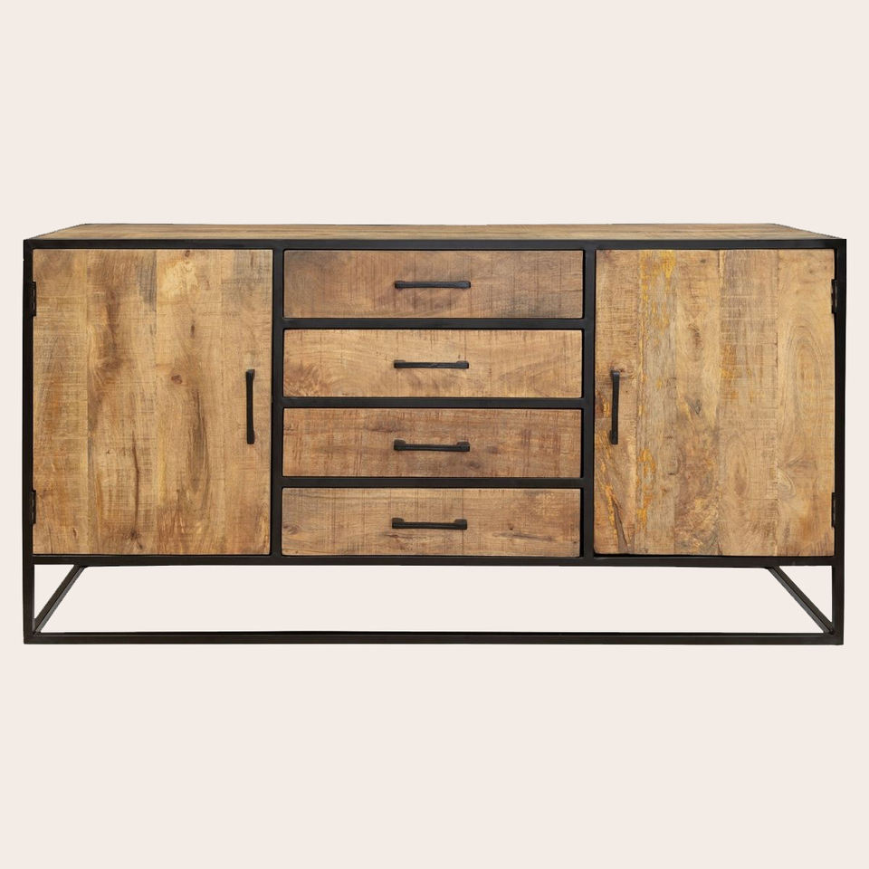 Industrial Style Mango Wood Dresser Storage Cabinet 4 Drawers 2 Doors Iron Frame Sideboard for Home Living Farmhouse Furniture