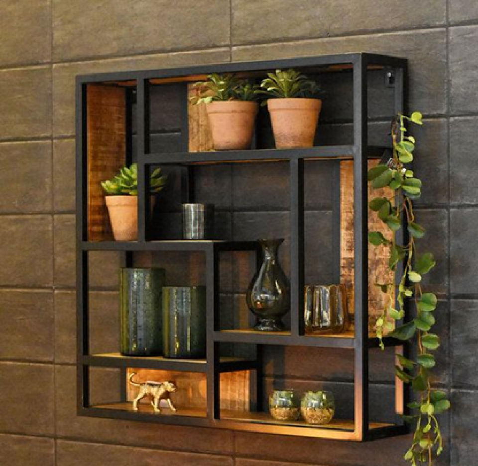 Industrial chic octagon metal & wood wall shelf, perfect for unique display. Available at wholesale prices.