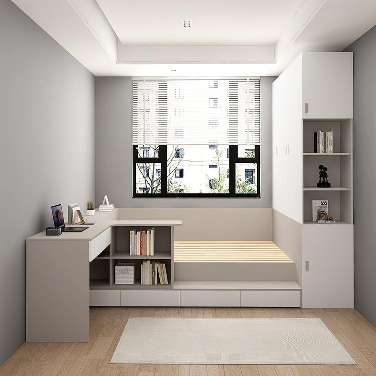 Inexpensive Multifunctional Wooden Hotel Bedroom Set Modern Platform Bed Side Table Wall Cabinets Wardrobe for Small Apartments