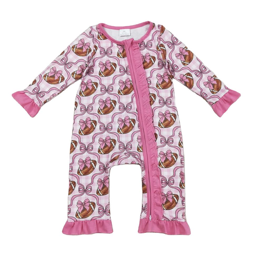 Infant baby girl Pink Football bows print kids wholesale floral romper long sleeve zipper jumpsuit child warmth sleeper set