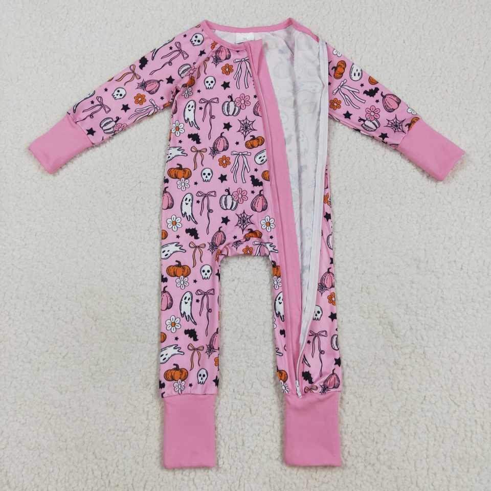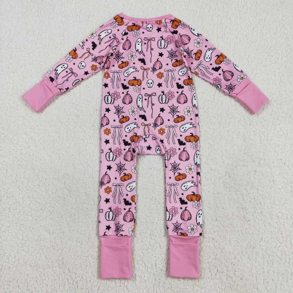 Infant baby girl Pink Pumpkin spooky pattern print kids wholesale halloween romper zipper jumpsuit child warmth sleeper set