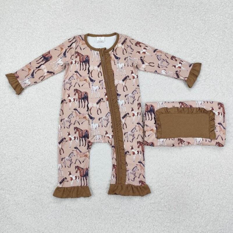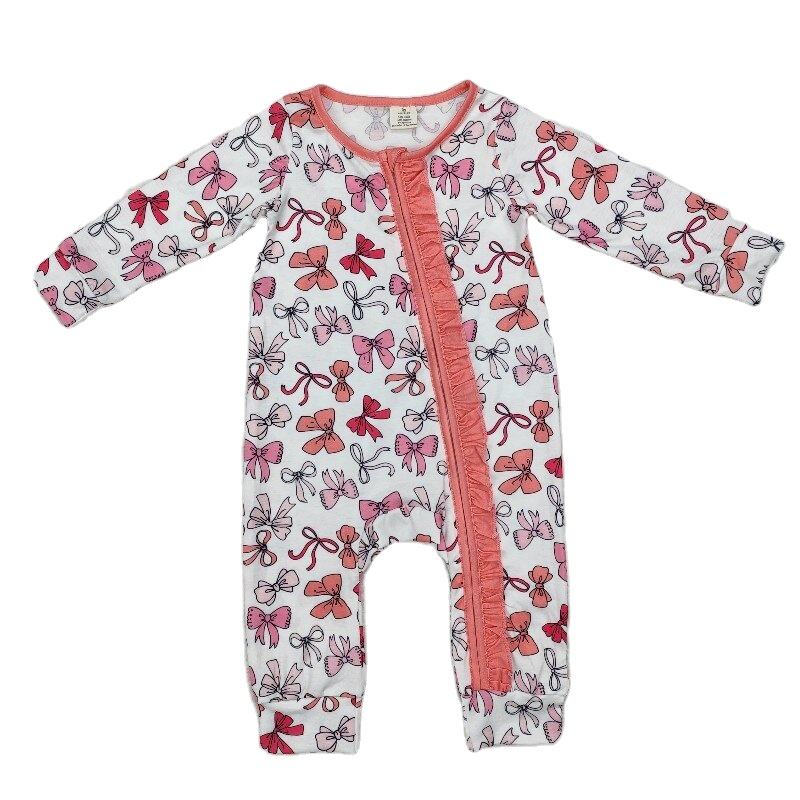 Infant baby girl pink bows print kids wholesale floral romper long sleeve zipper jumpsuit child warmth sleeper set