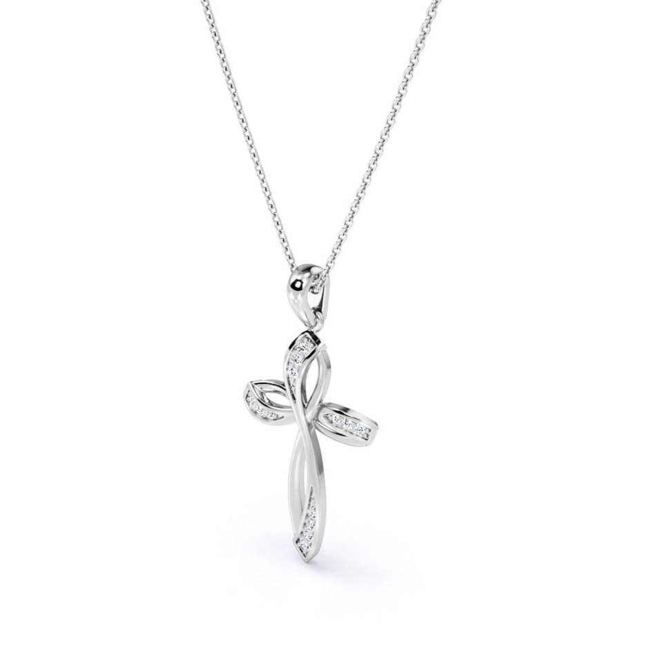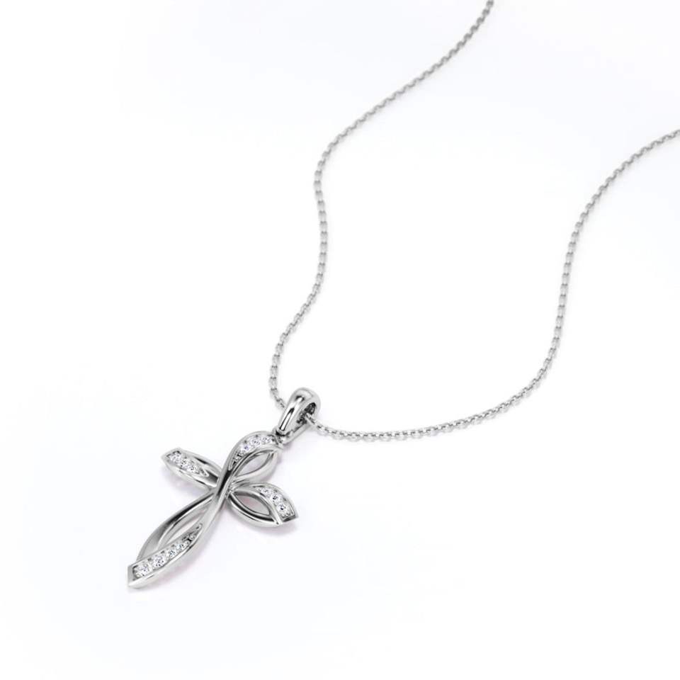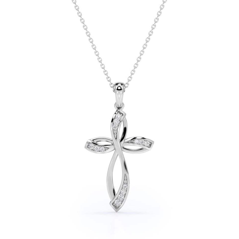 Infinity Mini-Pave Round Shape Moissanite Crucifix Pendant Necklace in 18K White Gold Plating over Silver