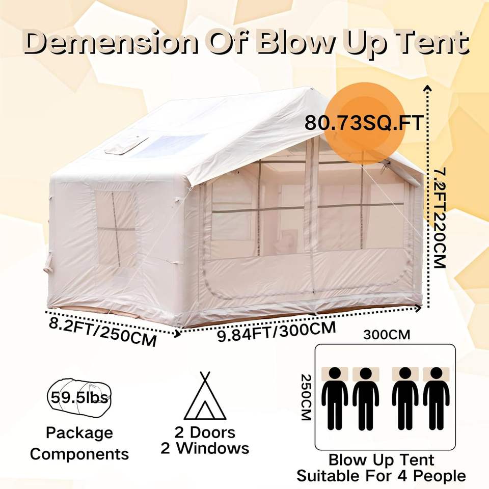 Inflatable tent with pump for 3-4 person instant glamping tent house Easy to set up blowing up family tent for 4 seasons