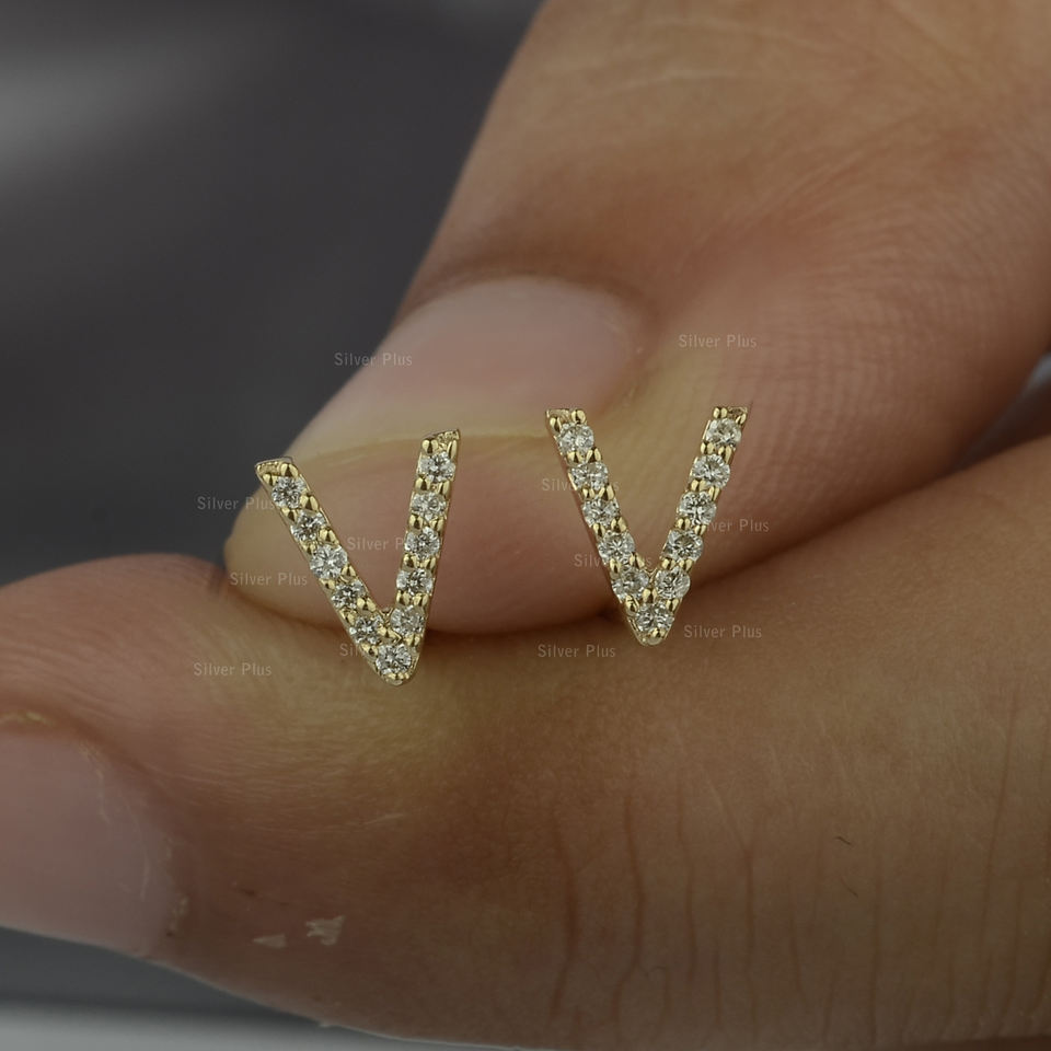 Initial Jewelry Custom A-Z Alphabets Diamond Earrings 14k Solid Gold "V" Letter Studs Also Available in 10K/18K