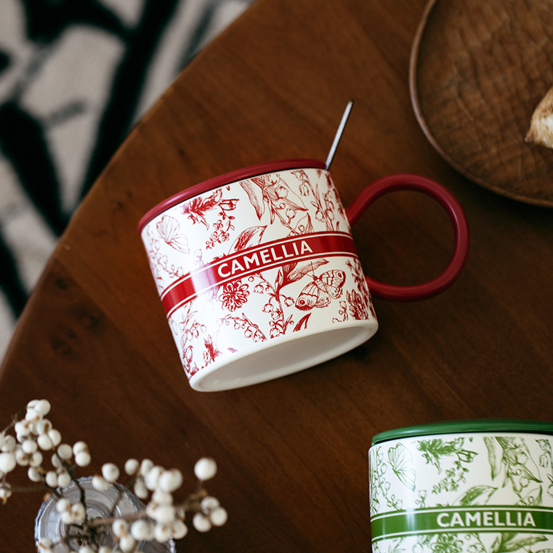 Ink Flower Ceramic Mug 380ml Party Use Cartoon Patterned Lid Spoon Custom Color Logo Dishwasher/Microwave Safe High End Feeling
