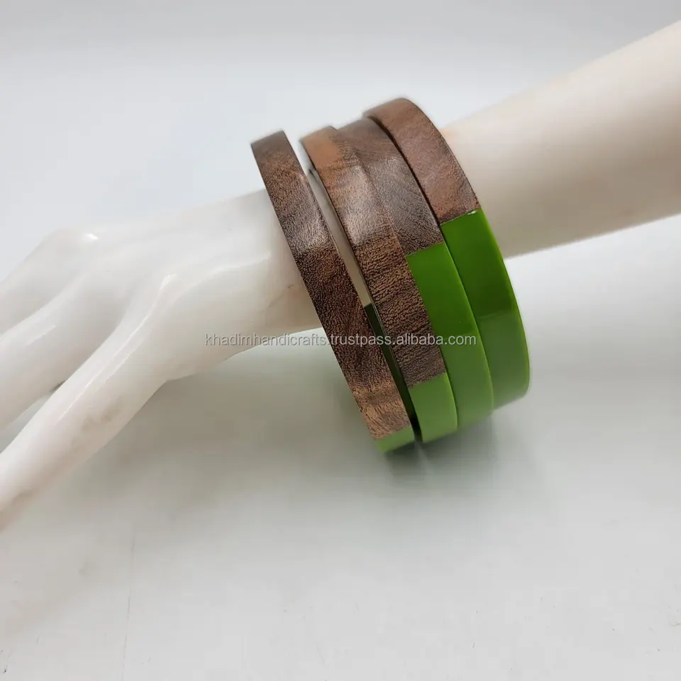"Inspirational Empowerment Acacia Wood Bangles Set, Four Pearl Bracelets with Light Green Epoxy Finish | Motivational