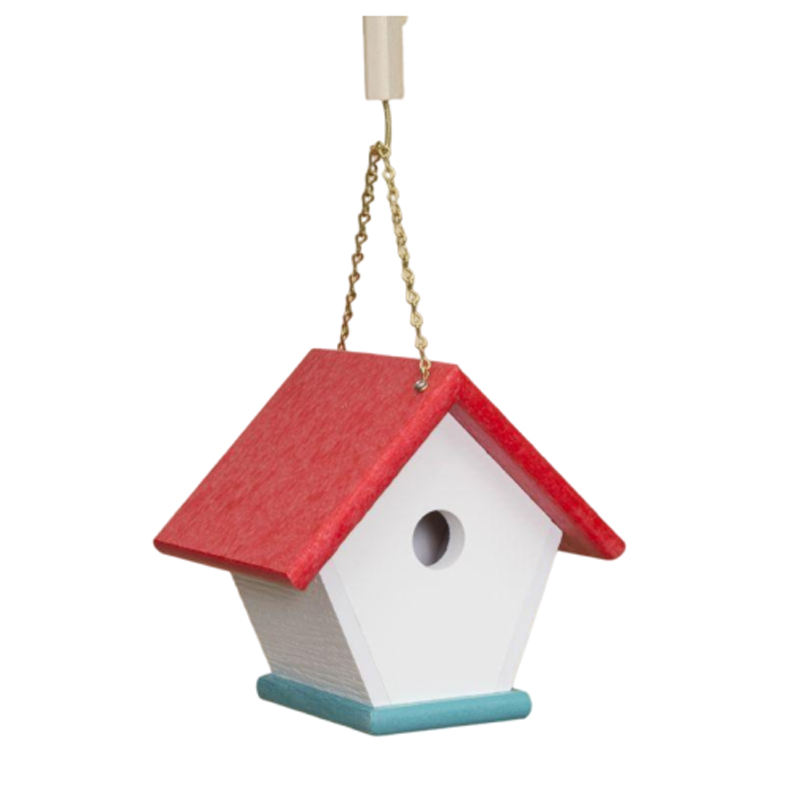Interactive Hanging Bird Cage Wooden Hut Shape Bird House with Metal Chain for Indoor Decorative Bird Feeder White & Red Colour