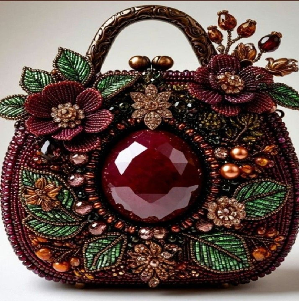 Intricate beaded bag with large 3D flowers and a central ruby gemstone. Fine available at wholesale prices