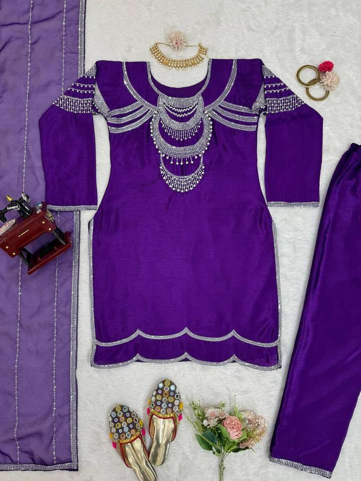 Chinon Silk Thread With Embroidery Sequence Work Top & Pant Dupatta
